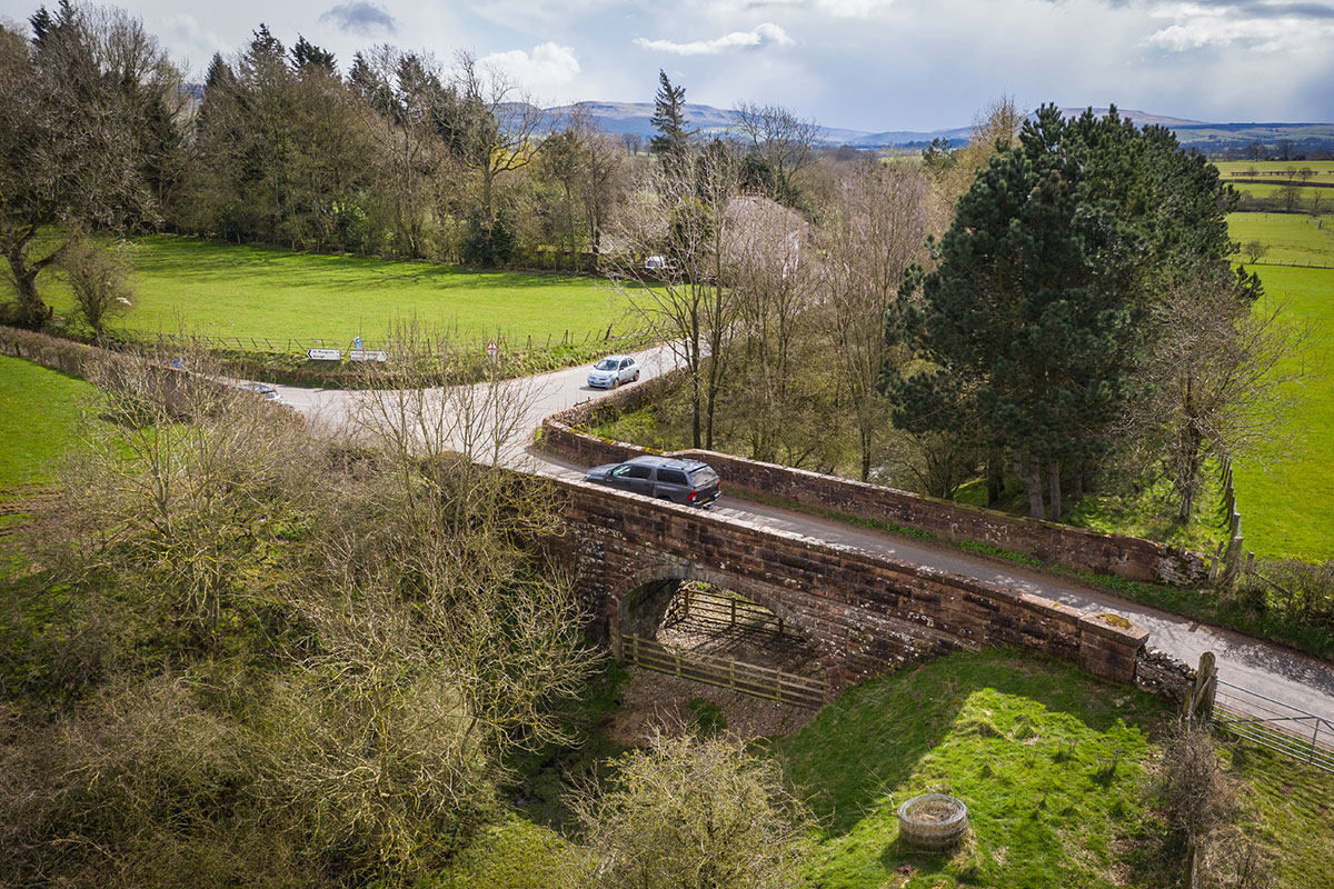 An aerial view, showing the setting of Great Musgrave bridge in the tranquil landscape of Cumbria's Eden Valley.